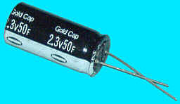 Goldcap - Supercap - Ultracap![]() Vor nicht allzu langer Zeit wurden Kondensatoren in Bruchteilen von Farad gemessen: pF, nF, µF. Mehr ging nicht. Goldcaps und Supercaps sind nicht nach herkömmlichen Kondensatortechnologien aufgebaut und Kapazitäten im Farad-Bereich. Allerdings kann man für Typen mit einigen tausend Farad mehrere 1000 Euro bezahlen, insbesondere, wenn sie für höhere Spannungen vorgesehen sind. Eine interessante Anwendung ist der Einsatz als "Starterbatterie" in der Kraftfahrzeugtechnik. Aber ganz so weit soll es hier nicht gehen. Der Einsatz in Modellfahr- und Flugzeugen ist schon interessant genug. In vielen Fällen reichen vielleicht 50 Farad. Auch das ist schon ein beachtlicher Wert. Eine LED können Sie damit schon viele Stunden betreiben. Die Betriebsdauer eines mit einem Goldcap versorgten Gerätes berechnet sich zu t = C x (Ul - Ug) / I t = Betriebsdauer (s), C =