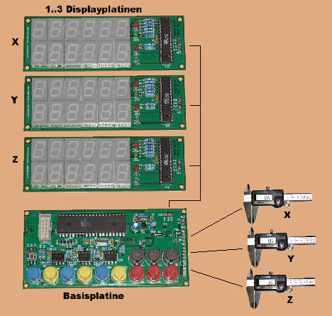 Die Basisbaugruppe erlaubt jetzt den Anschluss von 1 bis 3 Messschiebern und 1 bis 3 Displaybaugruppen für die x-, y- und z-Richtung. Es kann also sowohl mit einem, aber auch mit bis zu drei Messschiebern gearbeitet werden.